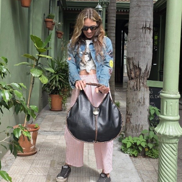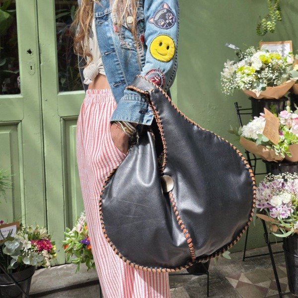 Cartera de cuero de forma circular con mucha capacidad. Está cosida con tientos de cuero a contratono, tiene bolsillo interno y cierre con broche imán. Además lleva un botón vintage que le da un toque original.