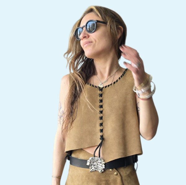 Top de gamuza con costuras de tiento de cuero. Es de doble uso: porque lo podés usar como TOP con la costura al frente, o como CHALECO, usarlo al revés con los botones al frente, abierto o cerrado.