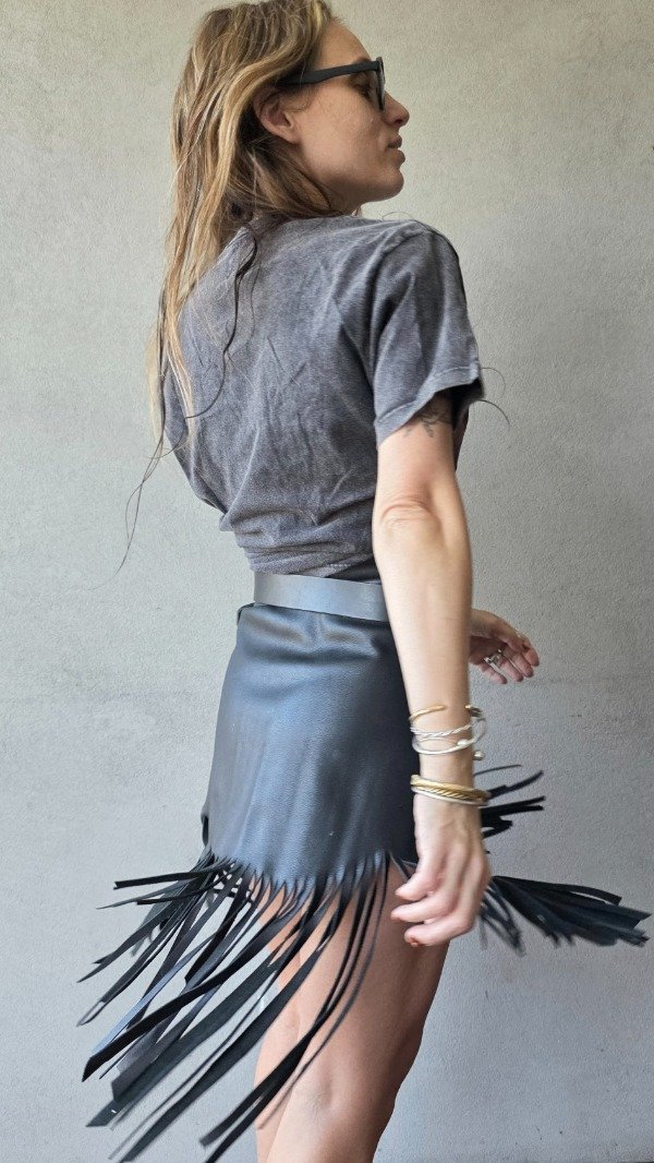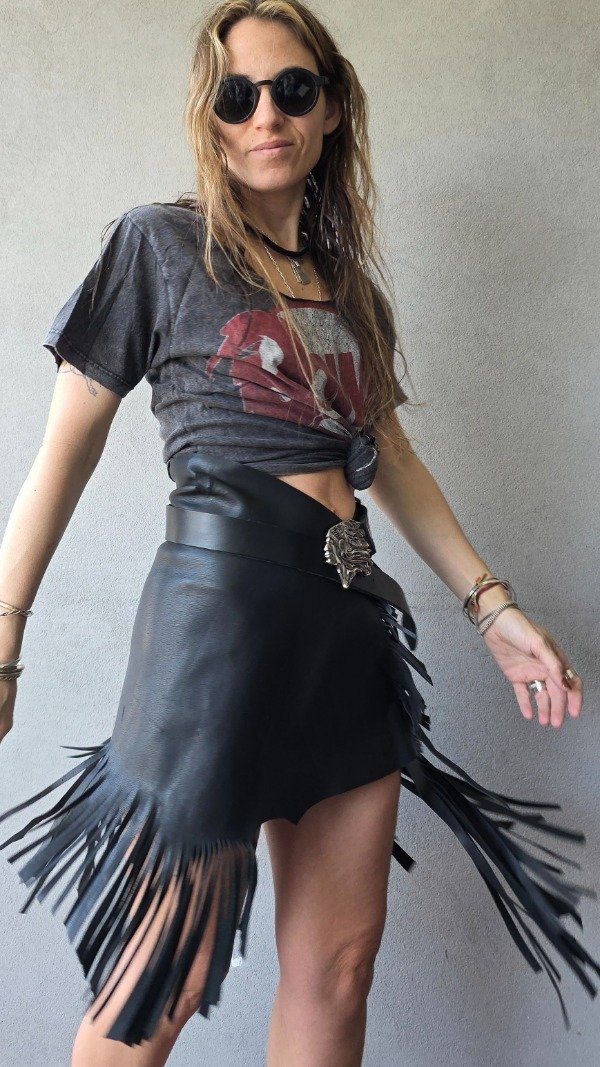 Pollera de cuero de una sola pieza. Largo irregular, con flecos en toda la vuelta.