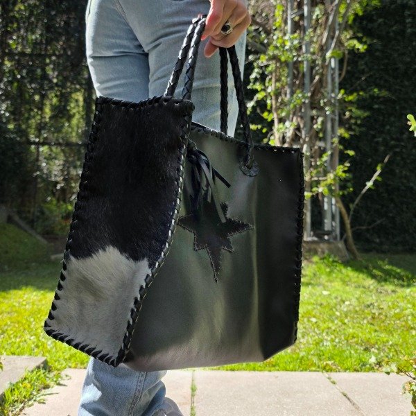 Cartera de cuero con flecos, super amplia! cosida con tientos de cuero, manijas cortas, bolsillo interno y cierre con broche imán. Medidas: 32x26x14 cm.