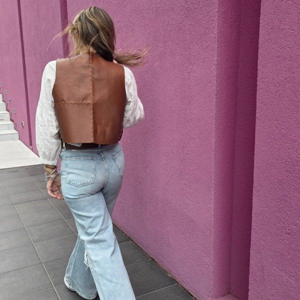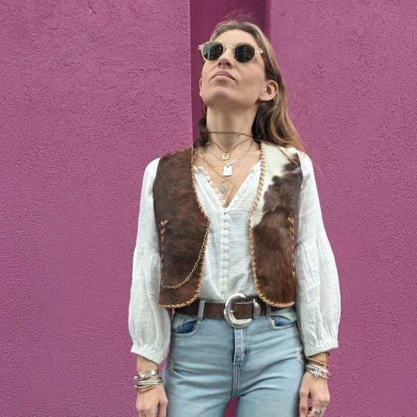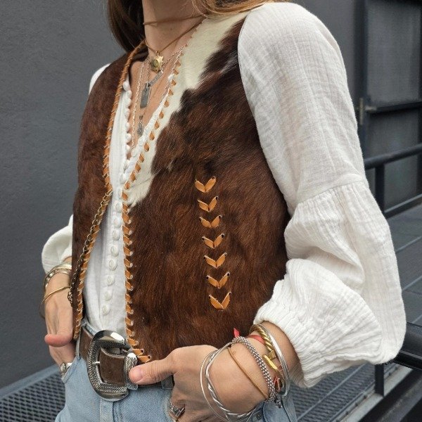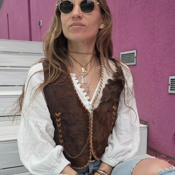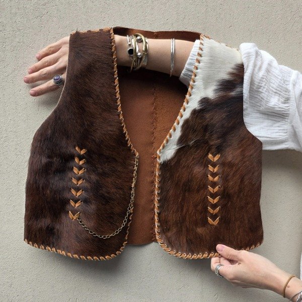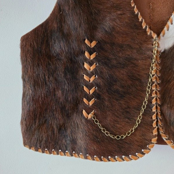 Chaleco de pelo holando, cosido con tientos de cuero, con cadena que le da un toque más rock.