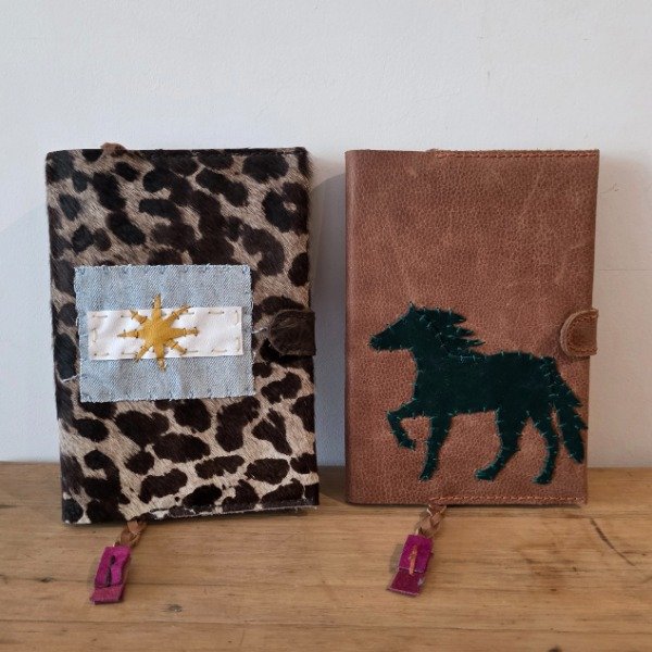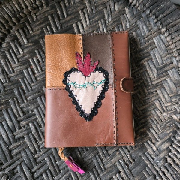 Cuaderno forrado con tapa de cuero REUTILIZABLE, con flores bordadas o con el sagrado corazón realizado en cuero o pintado.